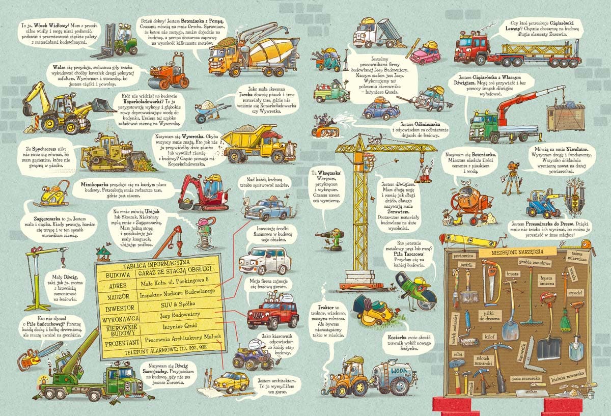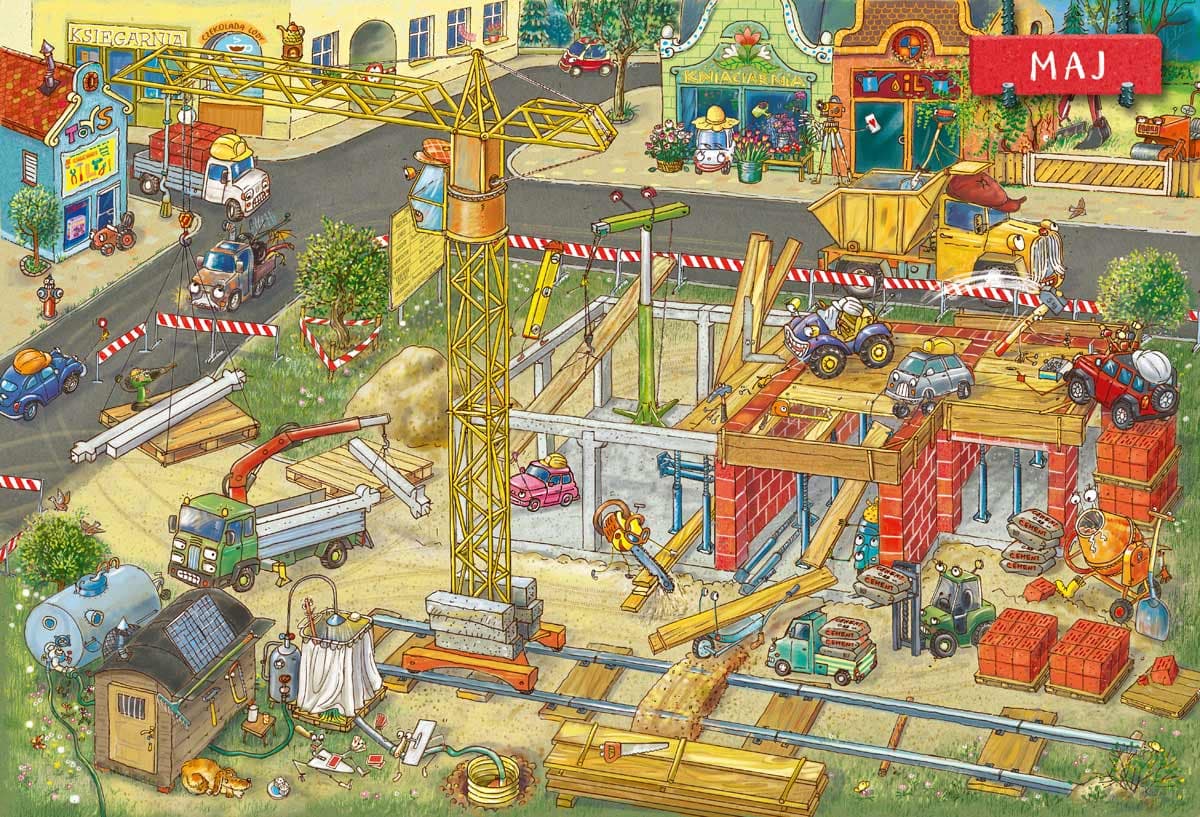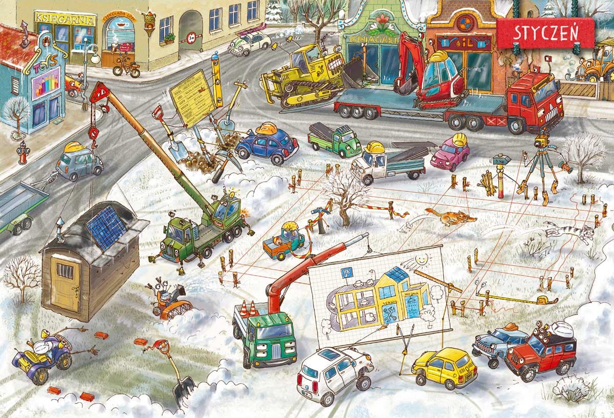 W miasteczku rusza budowa garażu ze stacją obsługi pojazdów i myjnią. Na placu budowy pojawia się Jeep Budowniczy ze swoją liczną ekipą: Koparką, Walcem, Spychaczem, Żurawiem, Betoniarką i wieloma innymi specjalistami. Trzeba uporządkować teren, przesadzić drzewo, wylać fundamenty, postawić ściany, otynkować je, wreszcie odebrać budynek… Praca wre. Dzielnym maszynom niestraszne pogoda i trud, jednak inwestor jest bardzo wymagający, a uroczyste otwarcie przewidziane na święta. Czy zdążą na czas? „Rok na placu budowy” zawiera dwanaście rozkładówek z kolejnymi miesiącami jednego roku. Dwie dodatkowe są poświęcone prezentacji bohaterów i interaktywnej zabawie. W każdym miesiącu plac budowy się zmienia. Zapraszamy młodych fanów motoryzacji do śledzenia dokonań nietypowych budowniczych i kibicowania im. Książkę można oglądać godzinami. Dzięki szczegółowym obrazkom dziecko ćwiczy spostrzegawczość, umiejętność opowiadania, ale przede wszystkim doskonale się bawi. Artur Nowicki jako chłopiec marzył, żeby zostać pilotem, dlatego najczęściej rysował samoloty. Później chciał być czołgistą i zaczął rysować same bitwy pod Studziankami. Myślał też o karierze krawca, ale nic z tego nie wyszło. Tata łamał sobie głowę, co z niego wyrośnie, a mama często mówiła, że chyba ksiądz, lecz nieznane są źródła tego pomysłu. Ostatecznie ukończył szkołę średnią jako mechanizator rolnictwa. Nie zdążył jednak popracować w zawodzie, bo zrozumiał, że to, co lubi najbardziej, to malowanie. Dlatego zdecydował się na studia na Wydziale Wychowania Artystycznego WSP w Częstochowie (obecnie Akademia Jana Długosza). W 1993 roku otrzymał dyplom z wyróżnieniem w pracowni prof. Jerzego Filipa Sztuki. Od ponad dwudziestu lat tworzy ilustracje do czasopism i książek dla dzieci. Organizuje i prowadzi spotkania oraz warsztaty twórcze dla dzieci i młodzieży. Mieszka z rodziną na wsi. Spędza dużo czasu w pracowni, gdzie wymyśla i rysuje bohaterów kolejnych książek.