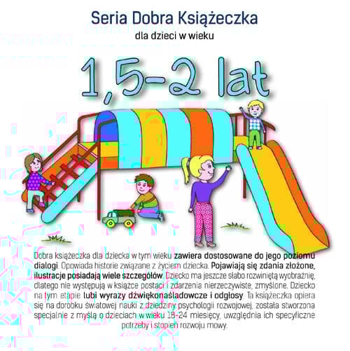 Seria Dobra Książeczka jest napisana i narysowana zgodnie z najnowszym stanem wiedzy psychologii rozwojowej. Na okładce posiada jasny, konkretny, rzeczowy i ciekawy opis etapu rozwoju dziecka.