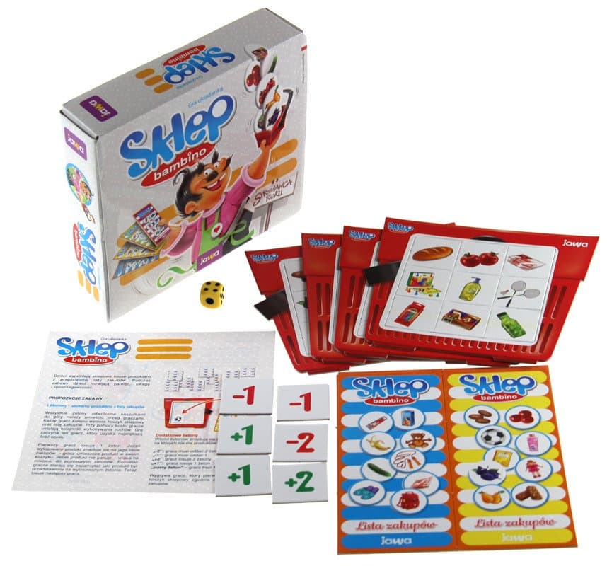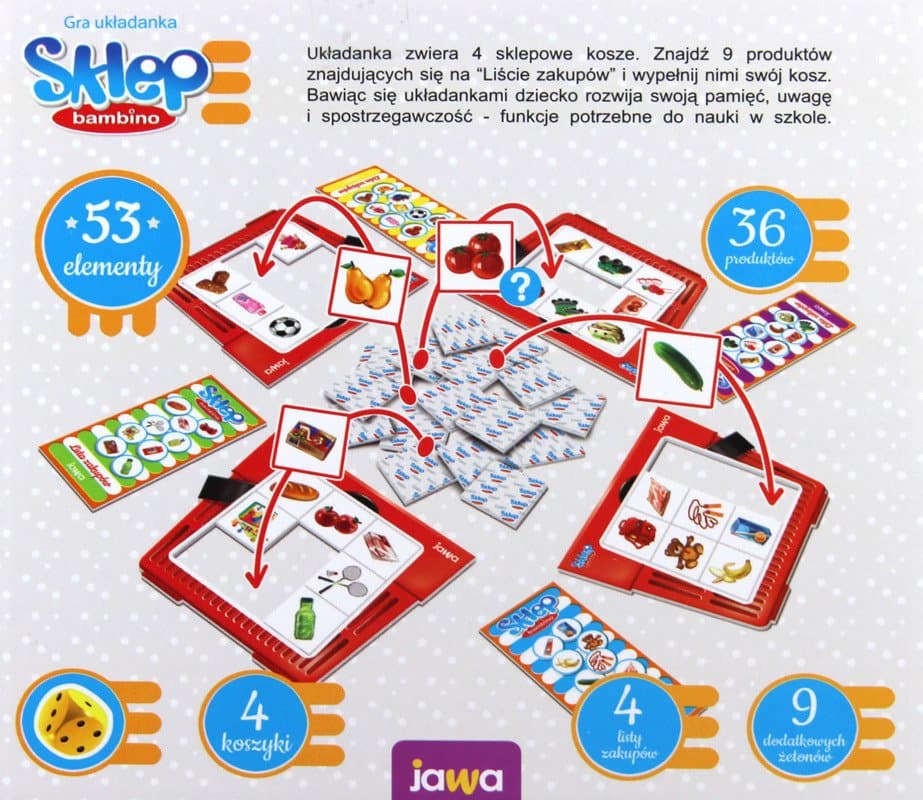 Układanka zawiera 4 sklepowe kosze. Znajdź 9 produktów znajdujących się na "Liście zakupów" i wypełnij nimi kosz. Bawiąc się układankami dziecko rozwija swoją pamięć, uwagę i spostrzegawczość - funkcje potrzebne do nauki w szkole. Wiek graczy: 4-6 Liczba graczy: 1-4 Czas rozgrywki: 30 minut