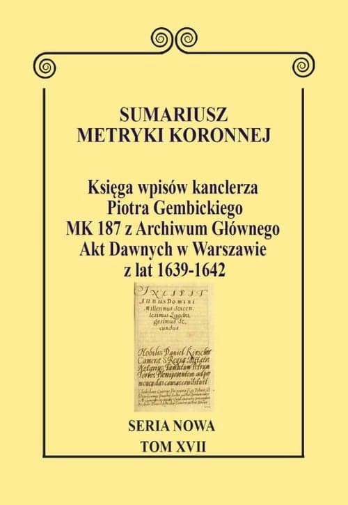 Szczegółowe informacje na temat książki Sumariusz metryki koronnej Seria nowa Księga wpisów kanclerza Piotra Gembickiego MK 187 z Archiwum Głównego Akt Dawnych w Warszawie z lat 1639–1642. Tom XVII.