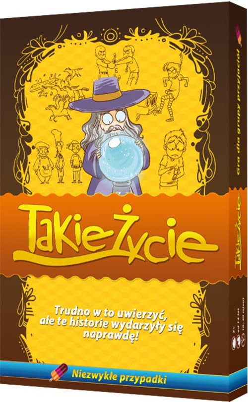 Trudno uwierzyć, że te historie wydarzyły się naprawdę! Wieje nudą? Jedziecie samochodem? Pociągiem? Czekacie na samolot? Czekacie aż piąty gracz wyjdzie z łazienki lub wróci ze sklepu, byście mogli w końcu zacząć grać w grę już rozłożoną na stole? ;) Wyciągnijcie "Takie Życie"! Jeden z Was dobiera losową kartę. Czyta krótką, acz niezwykłą historię, ale współgraczom ujawnia tylko wskazany kawałek. A teraz współgracze zadając pytania muszą dojść do tego, co tak naprawdę się wydarzyło! Oczywiście nie jest to proste, bo historie, mimo, że wydarzyły się naprawdę to są czasami naprawdę niewiarygodne! Dlatego każda z nich ma kilka kluczowych pytań zaznaczonych na karcie, które, jeśli zostaną zadane przez odgadujących, nie tylko dają im punkty, ale przede wszystkim pozwalają im zrozumieć, że podążają właściwym tropem! Jakim cudem pływaczka została niemal zabita przez wróbla? Dlaczego kapitan wyrzucił paliwo statku za burtę? Takie Życie 4 - Niezwykłe Przypadki to doskonała zabawa w dowolnym towarzystwie. Tutaj nie gra roli doświadczenie, tylko pomysłowość, szalone idee i chęć dobrej zabawy. Tu nie ma przegranych, tutaj wszyscy bawią się wyśmienicie tak, że Was aż brzuchy rozbolą! Takie Życie: Niezwykłe Przypadki to talia kart, którą można zabrać ze sobą wszędzie i wyciągnąć z kieszeni w dowolnym momencie. Tylko uważajcie! Gra jest tak wciągająca, że zanim się zorientujecie, możecie przegapić pociąg! :)