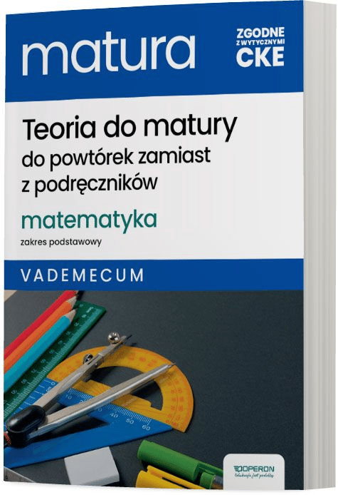 Vademecum – zbiór najważniejszych wiadomości niezbędnych na egzaminie maturalnym – pozwalający na naukę w takim rytmie, jakiego potrzebujesz. Zawiera: kompendium wiedzy podzielone na działy takie jak w repetytorium, podane syntetycznie jako podsumowanie całego cyklu nauki; często w formie wzorów, twierdzeń i przykładów do nich definicje i pojęcia wyróżnione w każdym dziale kolorową czcionką, co ułatwia ich zapamiętywanie utrwalenie wiedzy z danego działu matematyki znajduje się na jego końcu i ma postać grafu wybrane wzory matematyczne – takie same, jak te, które otrzymasz na maturze; dzięki temu oswoisz się z ich wyglądem, treściami i korzystaniem z nich podczas rozwiązywania zadań Jeśli potrzebujesz uczyć się z telefonu, tabletu lub komputera, to w serwisie znajdziesz te same treści, co w publikacji papierowej, a ponadto po zeskanowaniu kodu QR z książki otrzymasz dostęp do dodatkowych treści z repetytorium, czyli do: zasad oceniania do każdego zadania w formie opisu stosowanego przez CKE rozwiązań krok po kroku do każdego zadania z poszczególnymi etapami dochodzenia do rozwiązania filmów z rozwiązaniem wybranych zadańSzczegółowe informacje na temat książki Vademecum Nowa matura 2023 Matematyka Zakres podstawowy