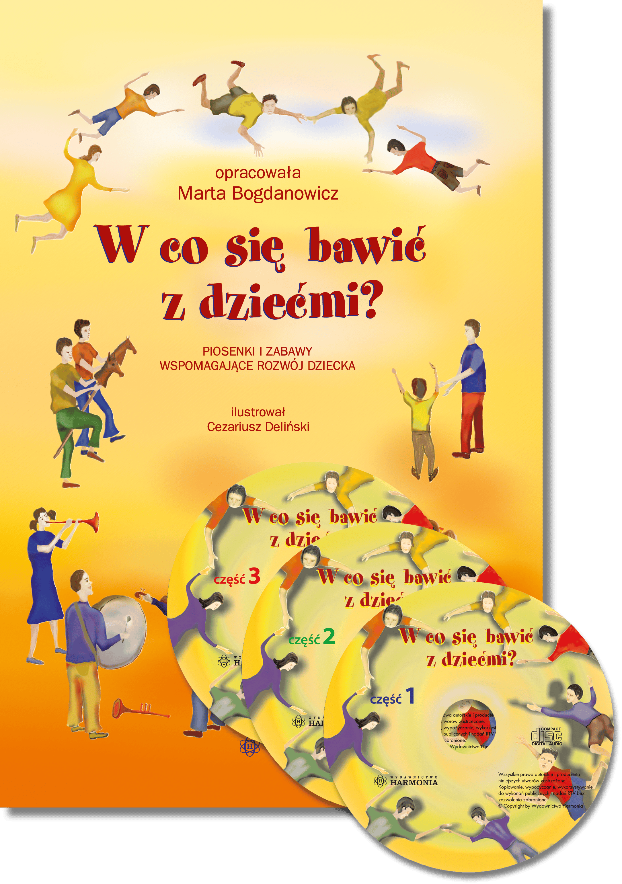 Książka ta powstała z myślą o najmłodszych – dzieciach 2-, 3-letnich i przedszkolakach. Zaprezentowane w niej piosenki i wierszyki można wykorzystywać zarówno w zabawie grupowej (w przedszkolu, na dziecięcym przyjęciu imieninowym, na podwórku), jak i podczas indywidualnej zabawy z dzieckiem (w trakcie kąpieli, na spacerze, przed zaśnięciem). Znalazły się tu piosenki rozpoczynające i kończące zajęcia, piosenki z imionami kształtujące świadomość własnej osoby, zabawy ułatwiające integrację z grupą, rozwijające świadomość ciała i przestrzeni, wreszcie znane zabawy przedszkolne i pląsy ruchowe. Do publikacji dołączone są 3 płyty CD.
