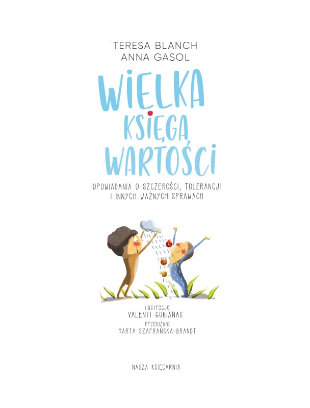 „Wielka księga wartości” to szesnaście niezwykłych opowieści, dzięki którym nauczymy się stawiać czoła trudnym sytuacjom i szukać ich rozwiązania. Dowiemy się, na czym polegają tolerancja, uprzejmość, solidarność, szczerość oraz empatia i jakie mają znaczenie w życiu każdego człowieka. Odkryjemy też, jak ważne jest akceptowanie siebie. To książka, którą można czytać bez końca. To książka, która uczy nas zrozumienia i empatii. To książka, która pokazuje, jak żyć. Przepięknie zilustrowana „Wielka księga wartości” pomoże również dorosłym, którzy chcieliby w przystępny sposób opowiedzieć dzieciom, czym kierować się w życiu. Teresa Blanch – studiowała dziennikarstwo i edytorstwo. Uzyskała stypendium niemieckiego rządu, które umożliwiło jej pracę w Międzynarodowej Bibliotece Młodzieżowej w Monachium. Obecnie współpracuje z hiszpańskimi wydawnictwami i pisuje do europejskich magazynów specjalizujących się w literaturze dziecięcej. Anna Gasol – jako dziewczynka uwielbiała słuchać historii opowiadanych przez babkę i czytać książki przygodowe. Studiowała angielski, filologię niemiecką, bibliotekoznawstwo. Pracowała jako nauczycielka oraz w bibliotece. Współpracuje z wieloma hiszpańskimi wydawcami, jest autorką licznych publikacji książkowych i prasowych dla dzieci oraz tłumaczką. Valentí Gubianas – ilustrowaniem zajął się jeszcze podczas studiów na uczelni artystycznej. Jego pierwsza książka ukazała się w 1995 roku i od tego czasu pracował dla licznych hiszpańskich wydawców. Ilustracje Valentíego Gubianasa zostały zaprezentowane na wystawie Archiginnasio podczas Targow Książki Dziecięcej w Bolonii 2017 roku.