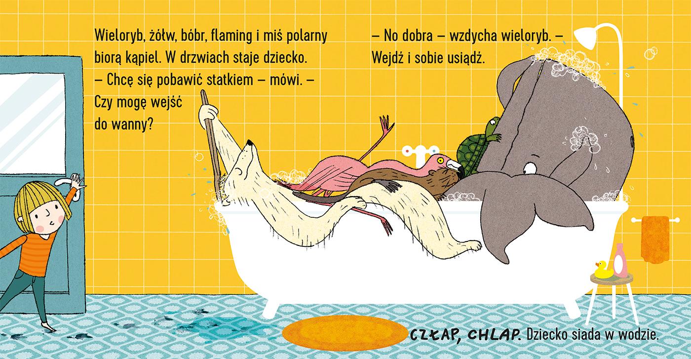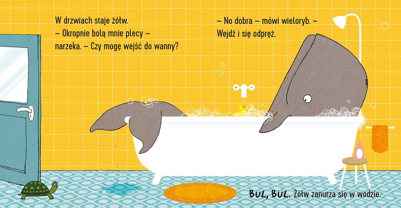 Wieloryb bierze kąpiel. Och, jak przyjemnie! W drzwiach staje żółw. – Czy mogę wejść do wanny? I – BUL-BUL – szybciutko zanurza się w wodzie. Kto będzie następny? Zabawna historyjka kąpielowa dla najmłodszych czytelników. Przyjazne, kolorowe ilustracje. Trwałe, kartonowe kartki. Opowieść z mnóstwem wyrazów dzwiękonaśladowczych przyciągających uwagę dziecka.