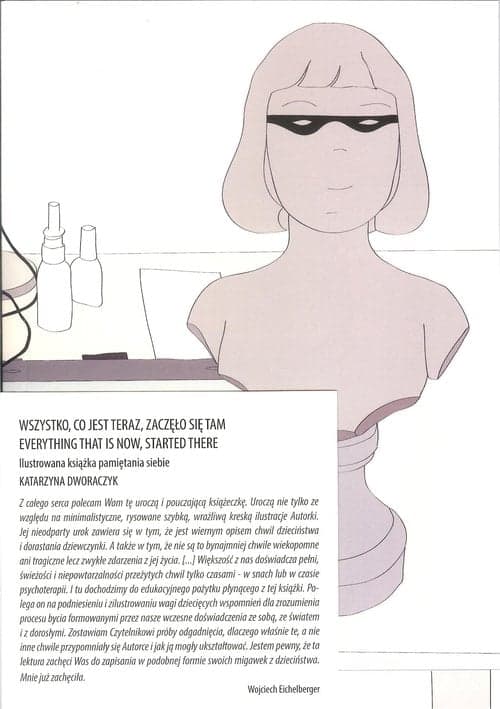 „Drodzy Czytelnicy. Z całego serca polecam Wam tę uroczą i pouczającą książeczkę.Uroczą nie tylko ze względu na minimalistyczne, rysowane szybką, wrażliwą kreską ilustracje Autorki. Jej nieodparty urok zawiera się w tym, że jest wiernym opisem chwil dzieciństwa i dorastania dziewczynki. A także w tym, że nie są to bynajmniej chwile wiekopomne ani tragiczne lecz zwykłe zdarzenia z jej życia. Cóż w tym interesującego ?- zapytasz Drogi Czytelniku. Otóż poruszające - a może nawet wzruszające - będzie dla ciebie uczucie bliskiego obcowania z chwytającym chwilę umysłem dziecka/dziewczynki. Bo tylko dzieci, poeci lub przebudzeni potrafią w dzisiejszych czasach realizować słynne carpe diem. Gdyby nie czas przeszły używany w tych migawkowych notatkach , można by je nawet porównać do chwytającego absolutny wymiar chwili japońskiego haiku. Większość z nas doświadcza pełni, świeżości i niepowtarzalności przeżytych chwil tylko czasami - w snach lub w czasie psychoterapii. I tu dochodzimy do edukacyjnego pożytku płynącego z tej książki. Polega on na podniesieniu i zilustrowaniu wagi dziecięcych wspomnień dla zrozumienia procesu bycia formowanymi przez nasze wczesne doświadczenia ze sobą, ze światem i z dorosłymi. Zostawiam Czytelnikowi próby odgadnięcia dlaczego właśnie te a nie inne chwile przypomniały się Autorce i jak ją mogły ukształtować. Jestem pewny, że ta lektura zachęci Was do zapisania w podobnej formie swoich migawek z dzieciństwa. Mnie już zachęciła.” WOJCIECH EICHELBERGER