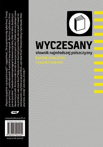 Najmłodsza polszczyzna to wciąż nieznany świat. Książka dziennikarza „Przekroju” Bartka Chacińskiego to fascynujący przewodnik nie tylko po języku młodych Polaków, ale też obraz ich rzeczywistości, aktualnych zjawisk i dominujących trendów. Autor analizuje próby wykorzystania młodego języka w reklamie i błędy popełniane przez copywriterów.  Dodatkowe atrakcje to raport o najnowszych tendencjach językowych w świecie mody, tekst o języku fanów gier komputerowych i możliwość uczestnictwa w niezwykłej klasówce, którą daje dyktando i test ze znajomości najmłodszej polszczyzny. Całość ozdabiają rysunki mistrza net-artu - enenka. Z tej książki każdy coś dla siebie wyczesze.