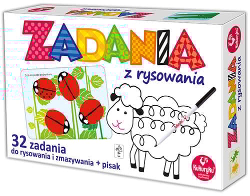Zadania z rysowania to zestaw tablic suchościeralnych z mazakiem i 48 zabawnymi zadaniami, które przygotowują dzieci do nauki pisania, pomagają w koncentracji, zachęcają je do pracy oraz uczą precyzji. Zestaw pozwala rozwinąć motorykę małą, uczy logicznego myślenia i kreatywności.