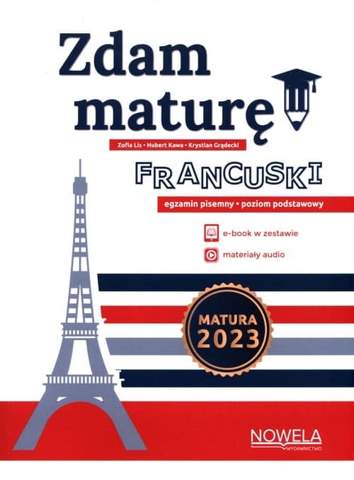 Zdam maturę! 2023. Język francuski, egzamin pisemny, poziom podstawowy - zadania przygotowujące do pisemnej matury z j. francuskiego na poziomie podstawowym w formule obowiązującej od 2023 roku. Wersja drukowana + ebook + nagrania online. Zbiór zadań umożliwiających przygotowanie do pisemnego egzaminu maturalnego z języka francuskiego na poziomie podstawowym w formule obowiązującej od 2023 roku. W komplecie z e-bookiem, nagraniami online i przykładowymi arkuszami maturalnymi udostępnionymi za pomocą kodów QR. Materiały i ćwiczenia zamieszczone w zbiorze: są dostosowane do wymagań egzaminacyjnych dotyczących matury od 2023 roku, uwzględniają wszystkie zmiany w formule egzaminu maturalnego – nowe umiejętności oraz nowe typy zadań, obejmują wszystkie umiejętności językowe oceniane na egzaminie pisemnym na poziomie podstawowym, uczniom pomagają w samodzielnym przygotowaniu do egzaminu maturalnego, nauczycielom dają możliwość indywidualizacji pracy z uczniami przystępującymi do egzaminu maturalnego z języka francuskiego, niezależnie od realizowanego w klasie programu nauczania. E-book z funkcjami interaktywnymi wygodna nawigacja wprowadzanie i zapisywanie notatek wykonywanie wydruków dostęp na urządzeniach mobilnych za pomocą kodu QR