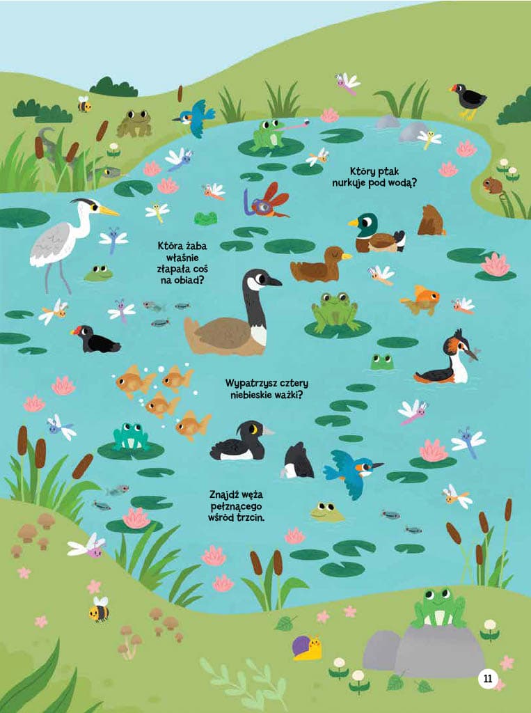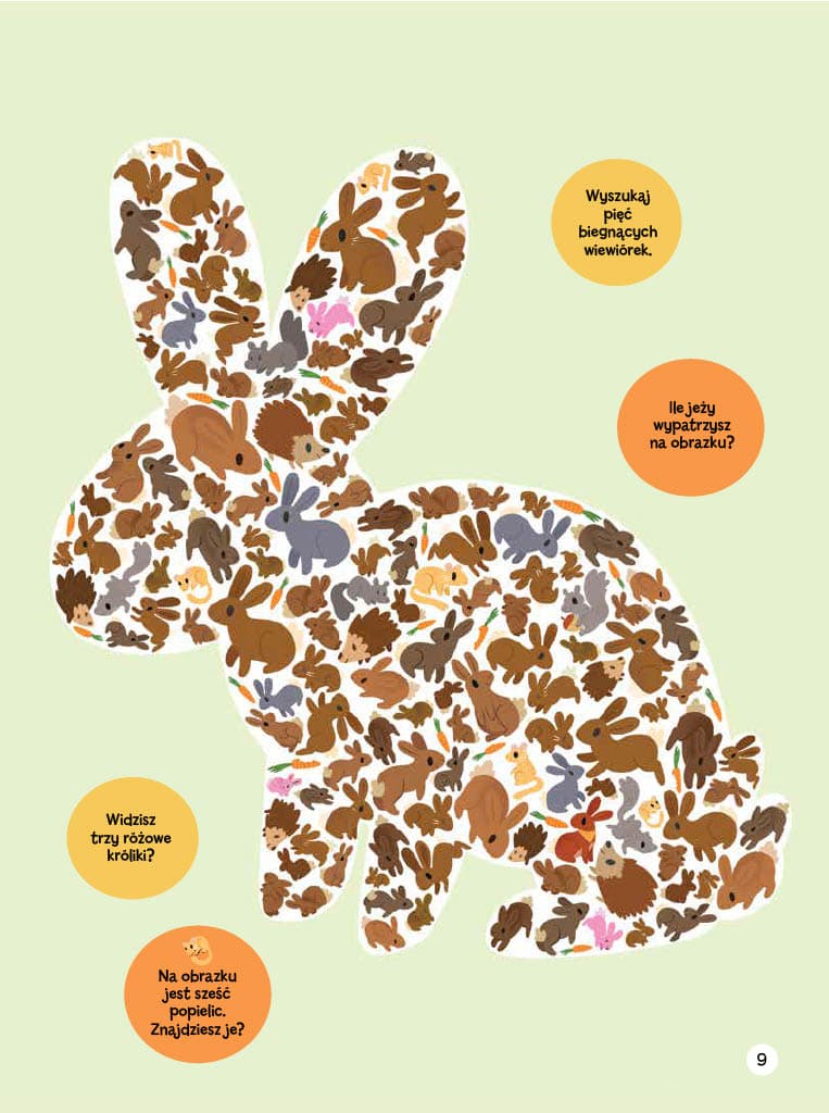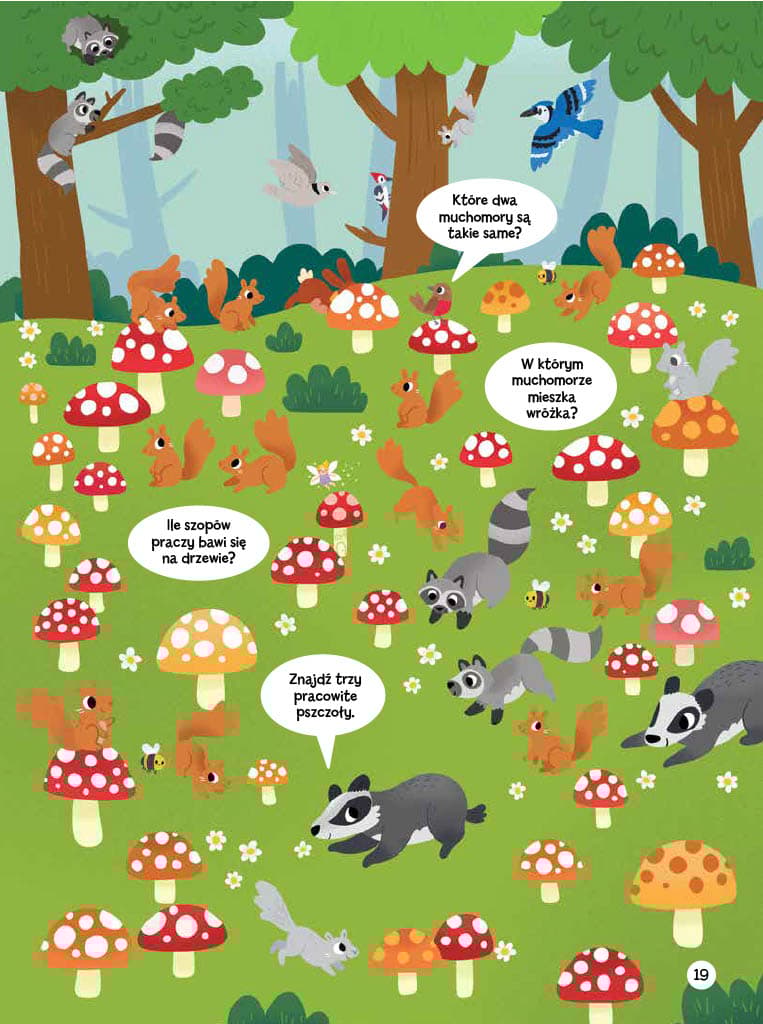 Zajrzyj do rozległego lasu i zobacz jak wiele zwierząt się w nim ukrywa. W tej niezwykłej książce z zadaniami spotkasz lisy, wiewiórki, niedźwiedzie, borsuki, motyle, ptaki i mnóstwo innych gatunków zwierzaków. Każdy obrazek jest pełny ciekawskich i wesołych leśnych mieszkańców. Twoim zadaniem jest ich odnaleźć, policzyć, a czasem też pokolorować. Wypełniona ponad 80 kolorowymi i różnorodnymi scenami książka „Znajdź ukryte zwierzaki” spodoba się dzieciom, które uwielbiają odkrywać przyrodę i otaczający świat. Każda scena zawiera podpowiedzi, które sugerują, czego szukać, ale to dzieci mogą cieszyć się znajdowaniem swoich ulubionych zwierząt, w tym małych wydr, wiewiórek, jeży i innych. Niektóre zwierzęta są czarno-białe, więc dzieci mogą je pokolorować. Te zadania pomogą w: - rozpoznawaniu różnych zwierząt leśnych, - rozwijaniu spostrzegawczości i koncentracji, - ćwiczeniu liczenia i logicznego myślenia. Ta zabawna i przystępna książka nagradza cierpliwość i uważną obserwację. Angażowanie się w te łamigłówki to idealny sposób dla na rozwój umiejętności potrzebnych skutecznej w edukacji. Seria „Ćwicz spostrzegawczość” Wydawnictwa Bookolika zachwyca pięknymi scenami z uroczymi zwierzętami i zabawnymi rzeczami do znajdowania i liczenia, pięknie zilustrowanymi przez Claire Stamper.