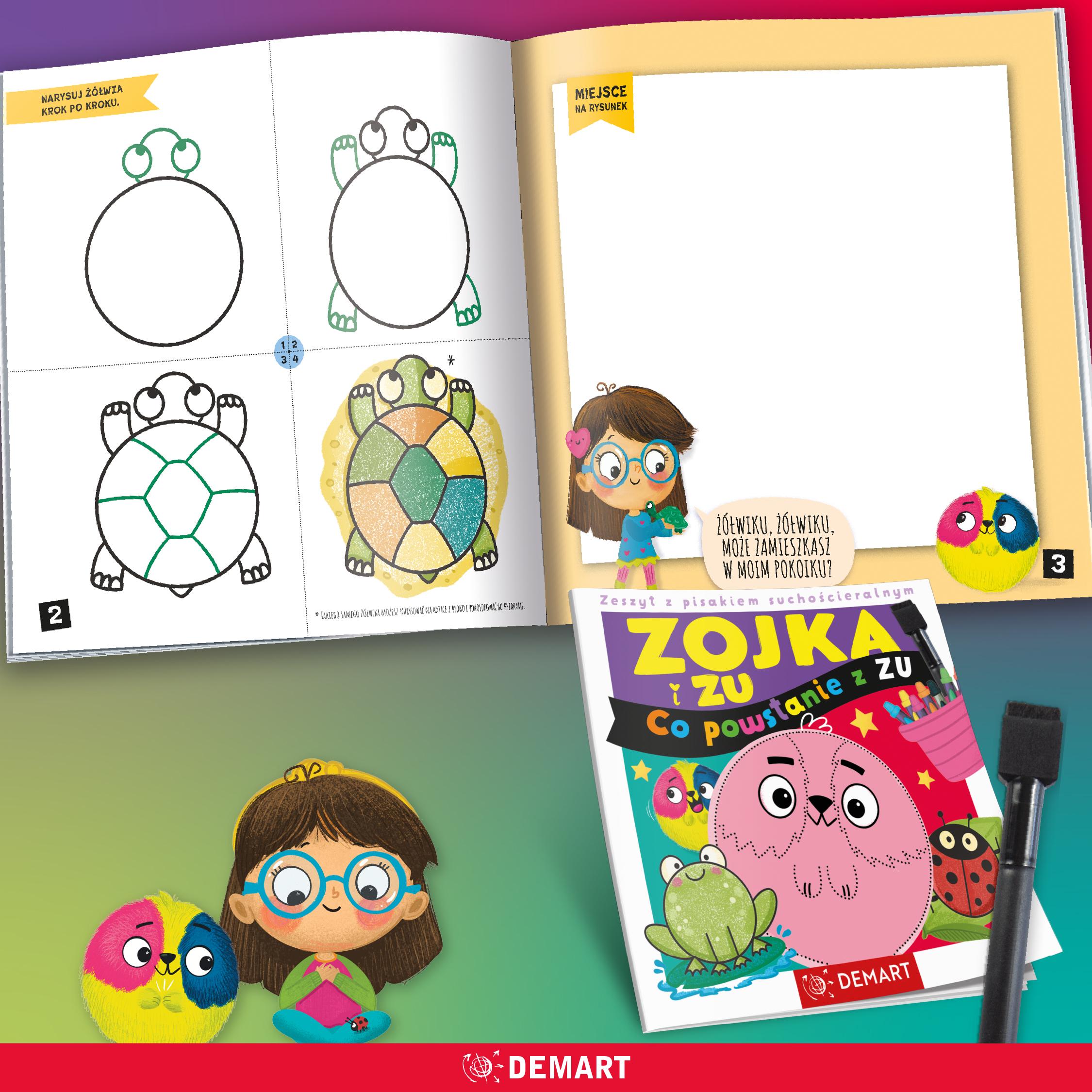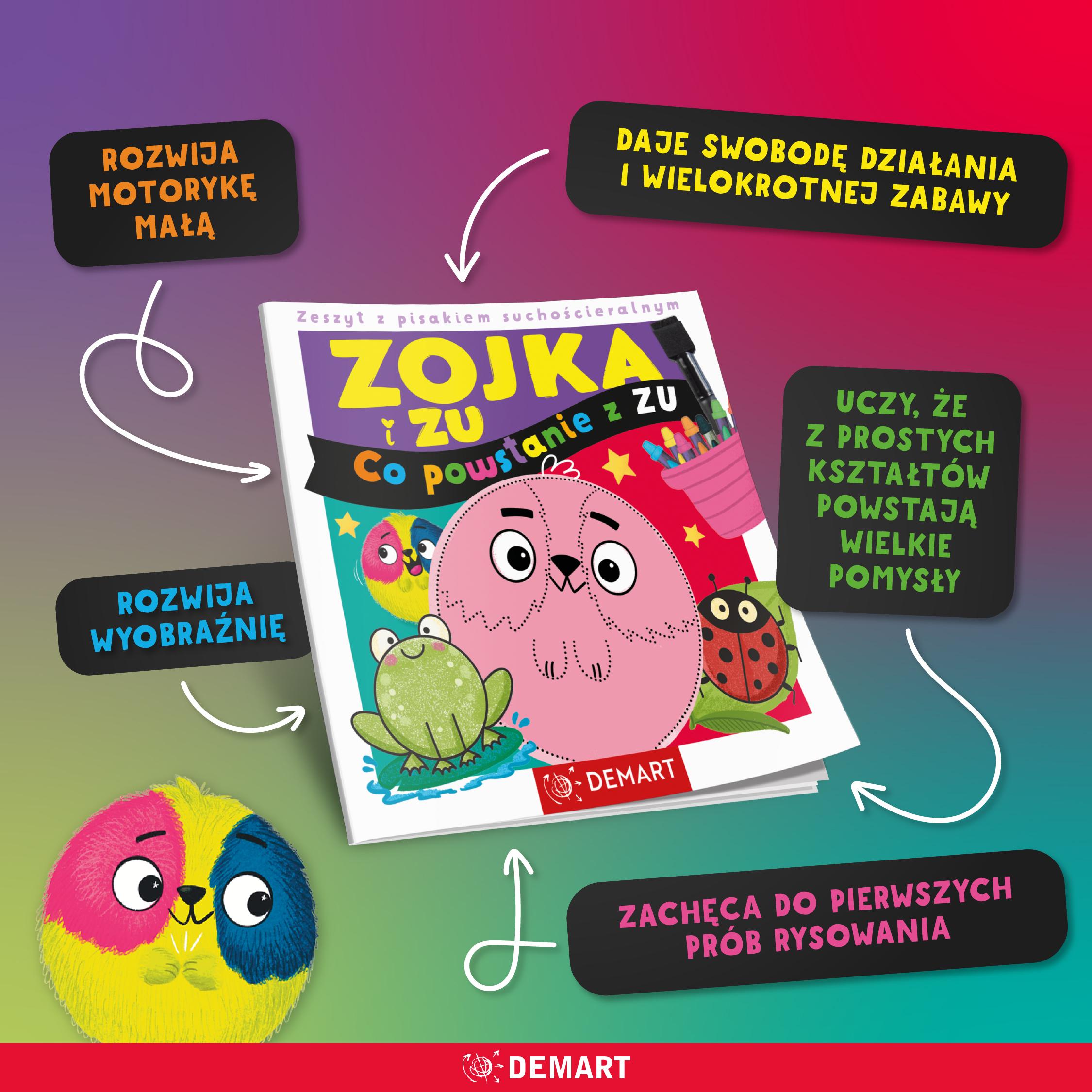 „Zojka i Zu. Co powstanie z Zu?” to poręczny, kreatywny zeszyt z pisakiem suchościeralnym, zaprojektowany specjalnie dla dzieci w wieku 3–5 lat. Krok po kroku zaprasza najmłodszych do czarowania obrazków z prostego kształtu koła – figury Zu – która w jednej chwili może stać się czymś zupełnie nieoczekiwanym.